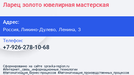 Ларец-золото, ювелирная мастерская по адресу Торговый дом "Дулёво", 9, Коммунистическая улица, Ликино-Дулёво, Орехово-Зуевский городской округ, Московская область, Центральный федеральный округ, 142670, Россия в дальнейшем Организация, размещена в следующих категориях: