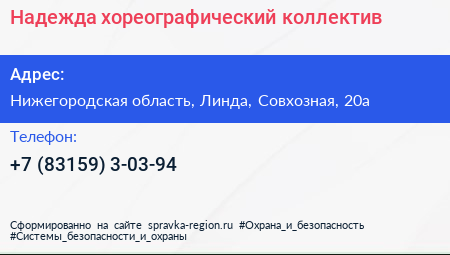 Надежда, хореографический коллектив по адресу Нижегородская область, Линда, Совхозная, 20а в дальнейшем Организация, размещена в следующих категориях: