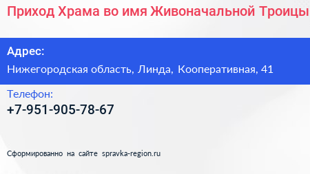 Приход Храма во имя Живоначальной Троицы по адресу Нижегородская область, Линда, Кооперативная, 41 в дальнейшем Организация, размещена в следующих категориях: