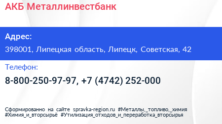 АКБ Металлинвестбанк по адресу 398001, Липецкая область, Липецк, Советская, 42 в дальнейшем Организация, размещена в следующих категориях: