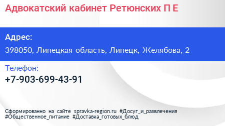 Адвокатский кабинет Ретюнских П.Е. по адресу 398050, Липецкая область, Липецк, Желябова, 2 в дальнейшем Организация, размещена в следующих категориях: