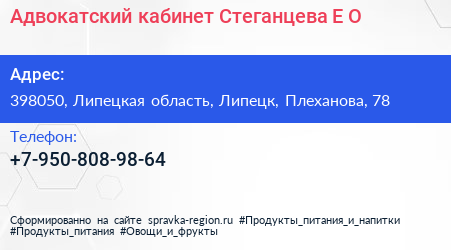 Адвокатский кабинет Стеганцева Е.О. по адресу 398050, Липецкая область, Липецк, Плеханова, 78 в дальнейшем Организация, размещена в следующих категориях: