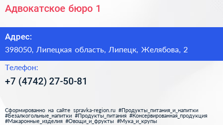 Адвокатское бюро №1 по адресу 398050, Липецкая область, Липецк, Желябова, 2 в дальнейшем Организация, размещена в следующих категориях: