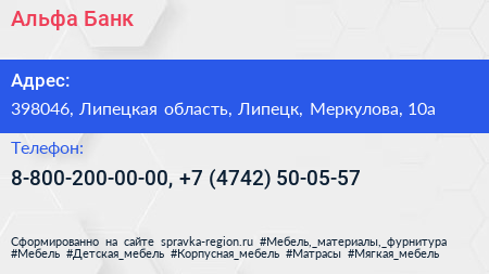 Альфа-Банк по адресу 398046, Липецкая область, Липецк, Меркулова, 10а в дальнейшем Организация, размещена в следующих категориях: