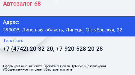 Автозалог 68 по адресу 398008, Липецкая область, Липецк, Октябрьская, 22 в дальнейшем Организация, размещена в следующих категориях: