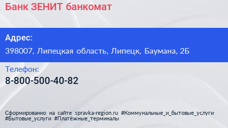 Банк ЗЕНИТ, банкомат по адресу 398007, Липецкая область, Липецк, Баумана, 2Б в дальнейшем Организация, размещена в следующих категориях: