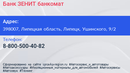 Банк ЗЕНИТ, банкомат по адресу 398007, Липецкая область, Липецк, Ушинского, 9/2 в дальнейшем Организация, размещена в следующих категориях: