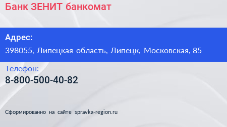 Банк ЗЕНИТ, банкомат по адресу 398055, Липецкая область, Липецк, Московская, 85 в дальнейшем Организация, размещена в следующих категориях: