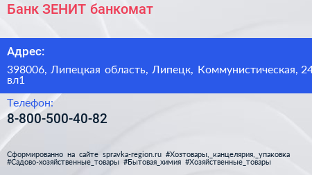 Банк ЗЕНИТ, банкомат по адресу 398006, Липецкая область, Липецк, Коммунистическая, 24 вл1 в дальнейшем Организация, размещена в следующих категориях: