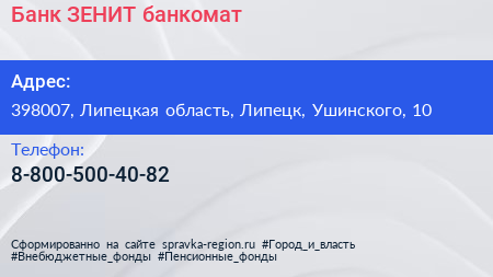 Банк ЗЕНИТ, банкомат по адресу 398007, Липецкая область, Липецк, Ушинского, 10 в дальнейшем Организация, размещена в следующих категориях: