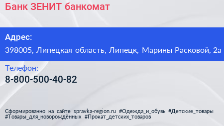Банк ЗЕНИТ, банкомат по адресу 398005, Липецкая область, Липецк, Марины Расковой, 2а в дальнейшем Организация, размещена в следующих категориях: