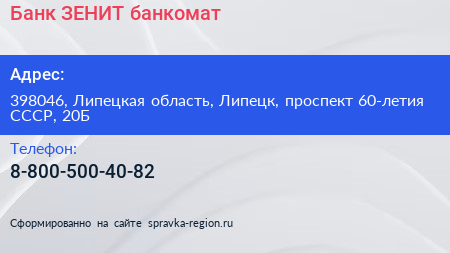 Банк ЗЕНИТ, банкомат по адресу 398046, Липецкая область, Липецк, проспект 60-летия СССР, 20Б в дальнейшем Организация, размещена в следующих категориях: