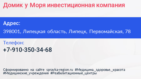 Домик у Моря, инвестиционная компания по адресу 398001, Липецкая область, Липецк, Первомайская, 78 в дальнейшем Организация, размещена в следующих категориях: