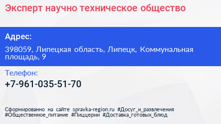 Эксперт, научно-техническое общество по адресу 398059, Липецкая область, Липецк, Коммунальная площадь, 9 в дальнейшем Организация, размещена в следующих категориях: