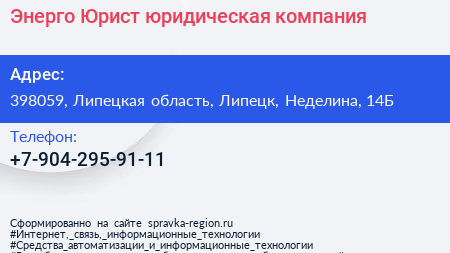 Энерго-Юрист, юридическая компания по адресу 398059, Липецкая область, Липецк, Неделина, 14Б в дальнейшем Организация, размещена в следующих категориях: