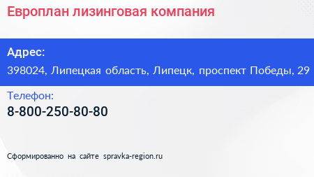 Европлан, лизинговая компания по адресу 398024, Липецкая область, Липецк, проспект Победы, 29 в дальнейшем Организация, размещена в следующих категориях:
