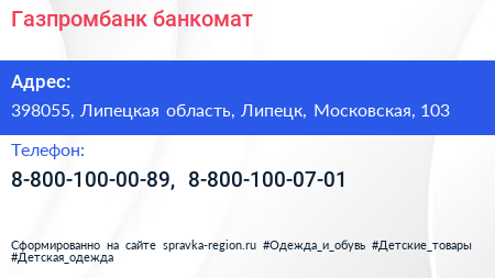 Газпромбанк, банкомат по адресу 398055, Липецкая область, Липецк, Московская, 103 в дальнейшем Организация, размещена в следующих категориях: