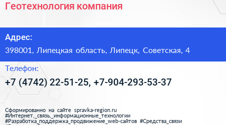 Геотехнология, компания по адресу 398001, Липецкая область, Липецк, Советская, 4 в дальнейшем Организация, размещена в следующих категориях: