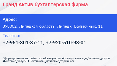 Гранд Актив, бухгалтерская фирма по адресу 398002, Липецкая область, Липецк, Балмочных, 11 в дальнейшем Организация, размещена в следующих категориях:
