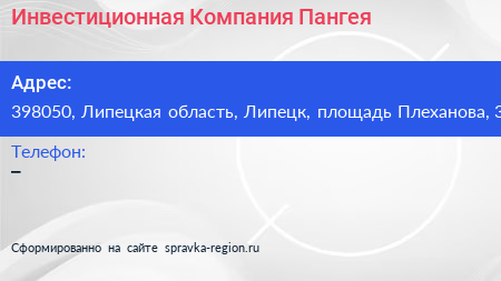 Инвестиционная Компания Пангея по адресу 398050, Липецкая область, Липецк, площадь Плеханова, 3 в дальнейшем Организация, размещена в следующих категориях: