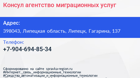Консул, агентство миграционных услуг по адресу 398043, Липецкая область, Липецк, Гагарина, 137 в дальнейшем Организация, размещена в следующих категориях:
