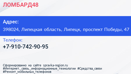ЛОМБАРД48+ по адресу 398024, Липецкая область, Липецк, проспект Победы, 47 в дальнейшем Организация, размещена в следующих категориях: