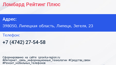 Ломбард Рейтинг Плюс по адресу 398050, Липецкая область, Липецк, Зегеля, 23 в дальнейшем Организация, размещена в следующих категориях: