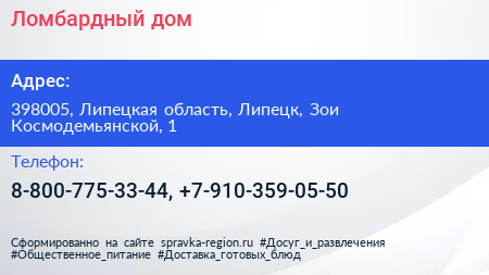Ломбардный дом по адресу 398005, Липецкая область, Липецк, Зои Космодемьянской, 1 в дальнейшем Организация, размещена в следующих категориях: