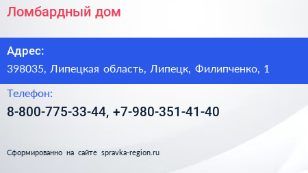 Ломбардный дом по адресу 398035, Липецкая область, Липецк, Филипченко, 1 в дальнейшем Организация, размещена в следующих категориях:
