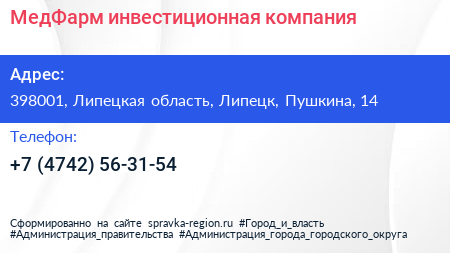 МедФарм, инвестиционная компания по адресу 398001, Липецкая область, Липецк, Пушкина, 14 в дальнейшем Организация, размещена в следующих категориях: