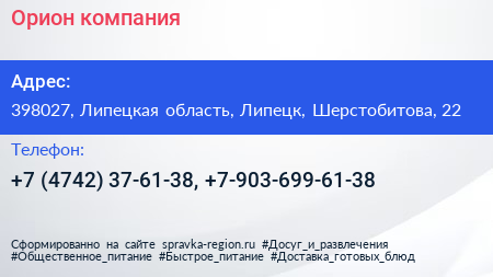 Орион, компания по адресу 398027, Липецкая область, Липецк, Шерстобитова, 22 в дальнейшем Организация, размещена в следующих категориях: