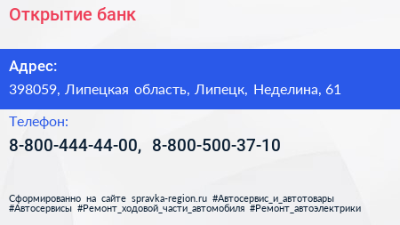 Открытие, банк по адресу 398059, Липецкая область, Липецк, Неделина, 61 в дальнейшем Организация, размещена в следующих категориях: