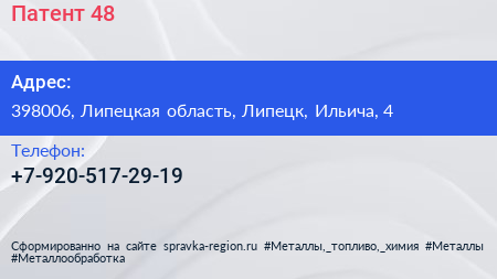 Патент 48 по адресу 398006, Липецкая область, Липецк, Ильича, 4 в дальнейшем Организация, размещена в следующих категориях:
