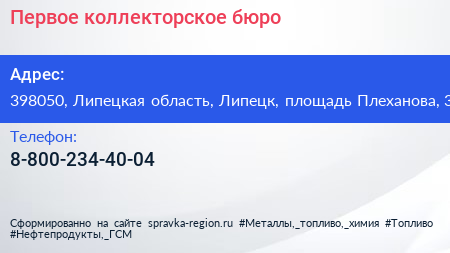 Первое коллекторское бюро по адресу 398050, Липецкая область, Липецк, площадь Плеханова, 3 в дальнейшем Организация, размещена в следующих категориях: