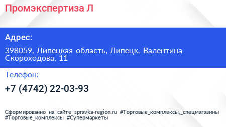 Промэкспертиза-Л по адресу 398059, Липецкая область, Липецк, Валентина Скороходова, 11 в дальнейшем Организация, размещена в следующих категориях: