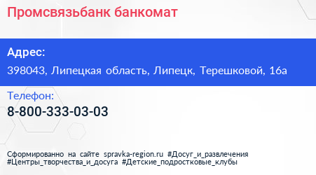 Промсвязьбанк, банкомат по адресу 398043, Липецкая область, Липецк, Терешковой, 16а в дальнейшем Организация, размещена в следующих категориях: