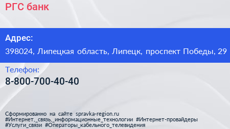 РГС банк по адресу 398024, Липецкая область, Липецк, проспект Победы, 29 в дальнейшем Организация, размещена в следующих категориях: