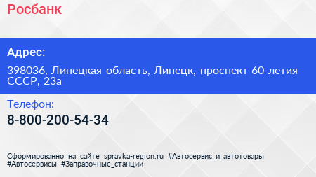 Росбанк по адресу 398036, Липецкая область, Липецк, проспект 60-летия СССР, 23а в дальнейшем Организация, размещена в следующих категориях: