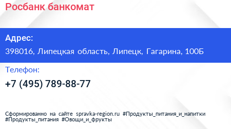 Росбанк, банкомат по адресу 398016, Липецкая область, Липецк, Гагарина, 100Б в дальнейшем Организация, размещена в следующих категориях: