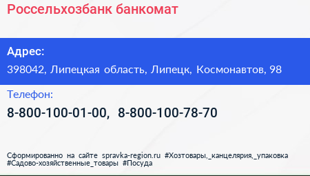 Россельхозбанк, банкомат по адресу 398042, Липецкая область, Липецк, Космонавтов, 98 в дальнейшем Организация, размещена в следующих категориях: