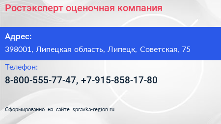 Ростэксперт, оценочная компания по адресу 398001, Липецкая область, Липецк, Советская, 75 в дальнейшем Организация, размещена в следующих категориях: