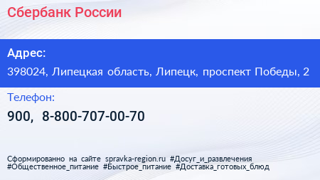 Сбербанк России по адресу 398024, Липецкая область, Липецк, проспект Победы, 2 в дальнейшем Организация, размещена в следующих категориях: