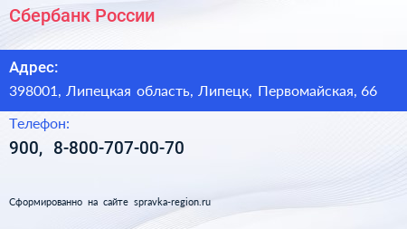Сбербанк России по адресу 398001, Липецкая область, Липецк, Первомайская, 66 в дальнейшем Организация, размещена в следующих категориях: