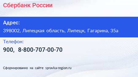 Сбербанк России по адресу 398002, Липецкая область, Липецк, Гагарина, 35а в дальнейшем Организация, размещена в следующих категориях:
