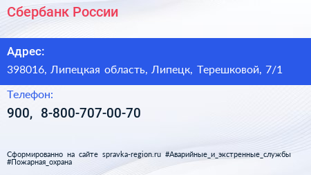 Сбербанк России по адресу 398016, Липецкая область, Липецк, Терешковой, 7/1 в дальнейшем Организация, размещена в следующих категориях: