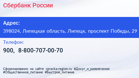 Сбербанк России по адресу 398024, Липецкая область, Липецк, проспект Победы, 29 в дальнейшем Организация, размещена в следующих категориях: