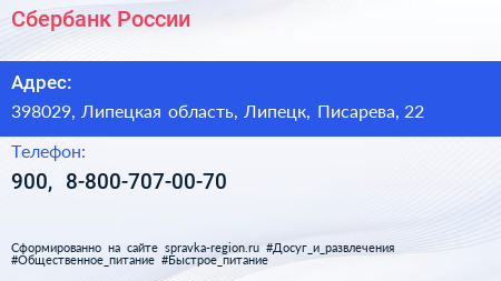Сбербанк России по адресу 398029, Липецкая область, Липецк, Писарева, 22 в дальнейшем Организация, размещена в следующих категориях: