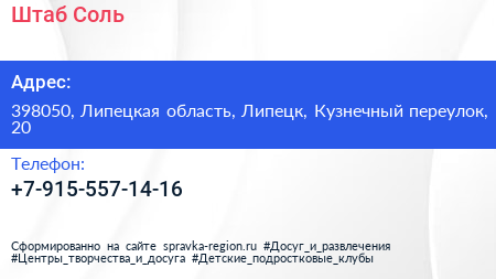 Штаб Соль+ по адресу 398050, Липецкая область, Липецк, Кузнечный переулок, 20 в дальнейшем Организация, размещена в следующих категориях: