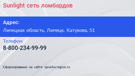 Sunlight, сеть ломбардов по адресу Липецкая область, Липецк, Катукова, 51 в дальнейшем Организация, размещена в следующих категориях: