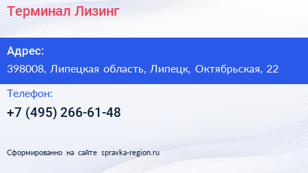 Терминал Лизинг по адресу 398008, Липецкая область, Липецк, Октябрьская, 22 в дальнейшем Организация, размещена в следующих категориях: